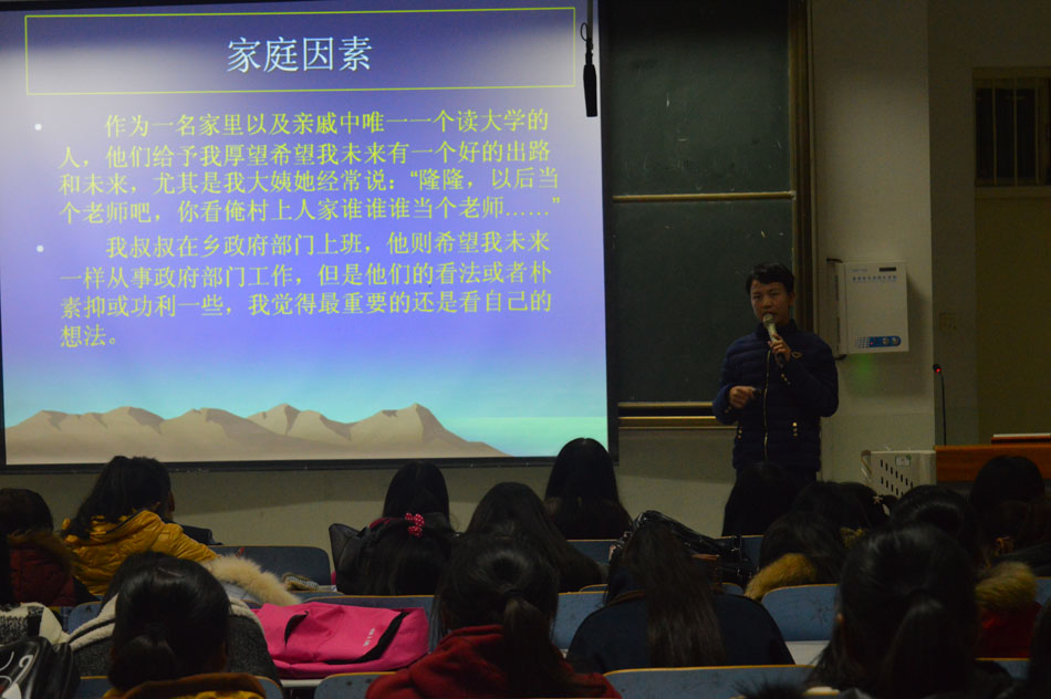 树立青春梦想,铸就精彩人生。11月23日晚,万象城体育awcsport第三届“我的职业生涯规划”演讲比赛决赛在人文楼308教室拉开帷幕,万象城体育awcsport团总支书记任芳,辅导员陈龙、孔宪巍以及学生会部分成员担任评委,与近200名学子共同观看本次比赛。